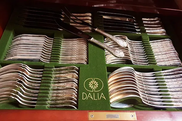 Dalia es otro modelo habitual en cuberterías de plata antiguas. Suele encontrarse en juegos completos guardados en estuches o muebles expositores.